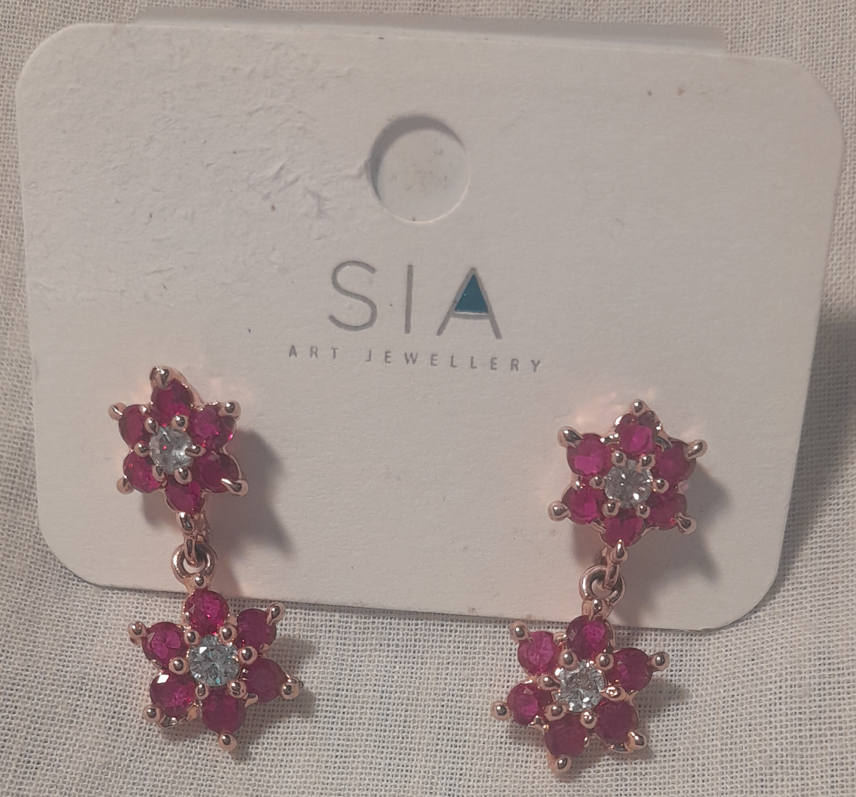 Chic double-flower drop earrings in a rose-gold tone, each with a petite pink crystal blossom at the stud and a matching dangling flower with a clear center stone. Playful sparkle that brightens casual looks and party outfits alike.