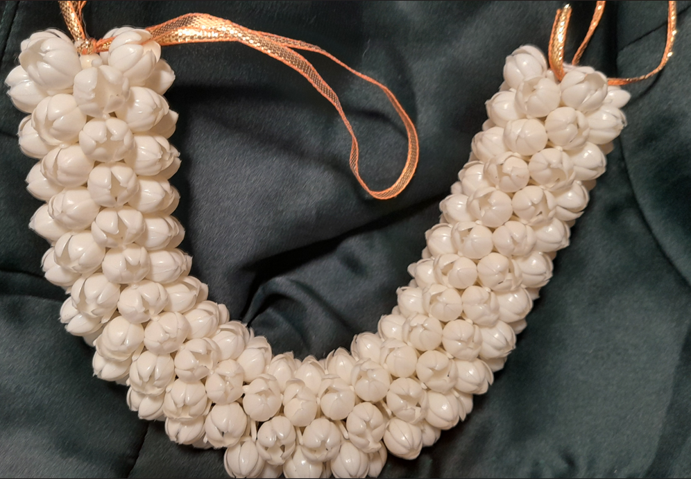 A thick, U-shaped garland crafted from clustered artificial jasmine buds for a fresh, traditional look. Adjustable ribbon ties for a comfortable fit—perfect for puja, temple visits, haldi/mehendi, Bharatanatyam, or festive outfits.