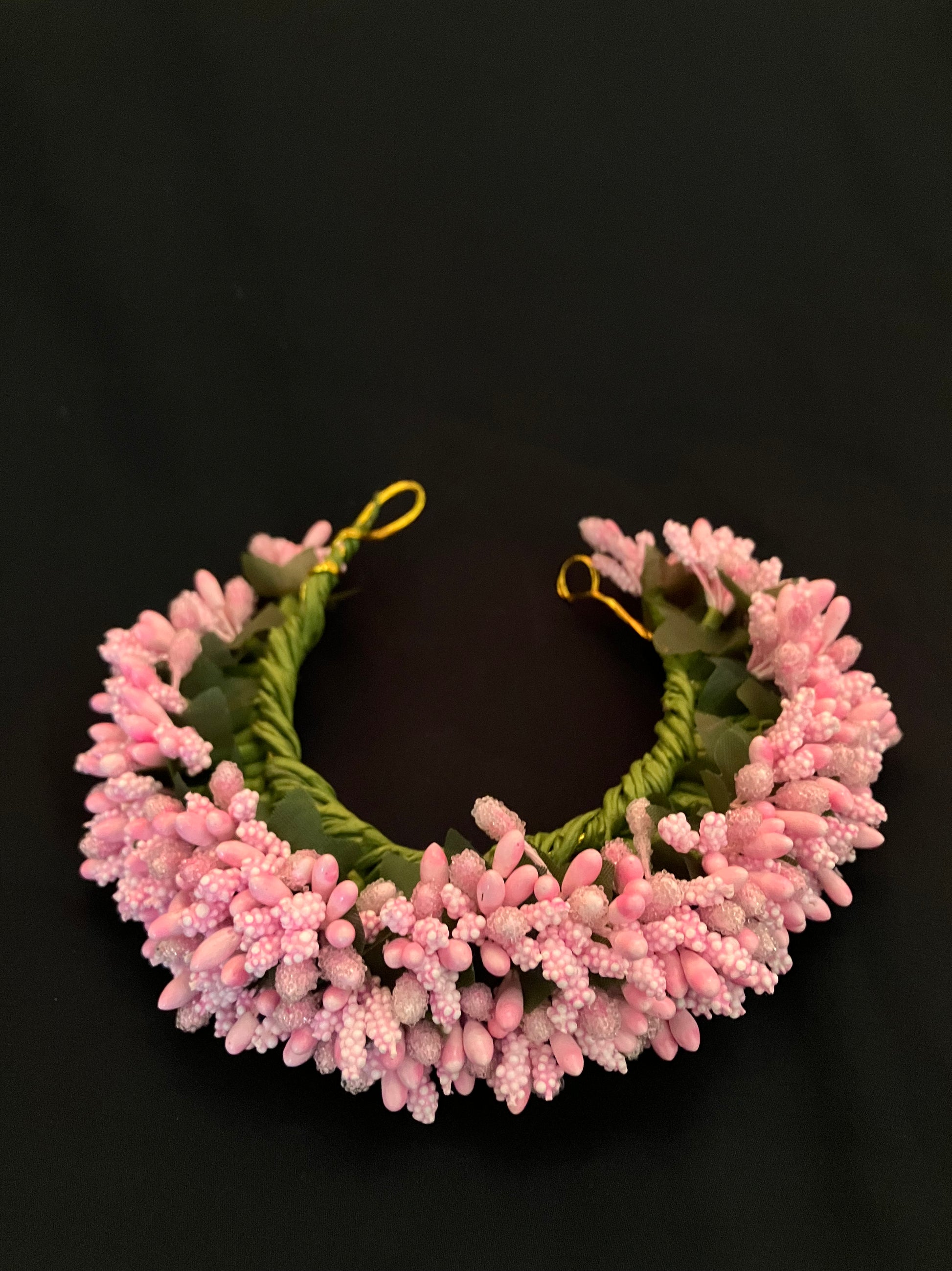 Half-moon artificial floral gajra crafted with dense pastel-pink buds and green leaves on a hand-wrapped base. Flexible curve with gold tone string at both ends to secure around a bun or braid—perfect for puja, weddings, and classical dance.