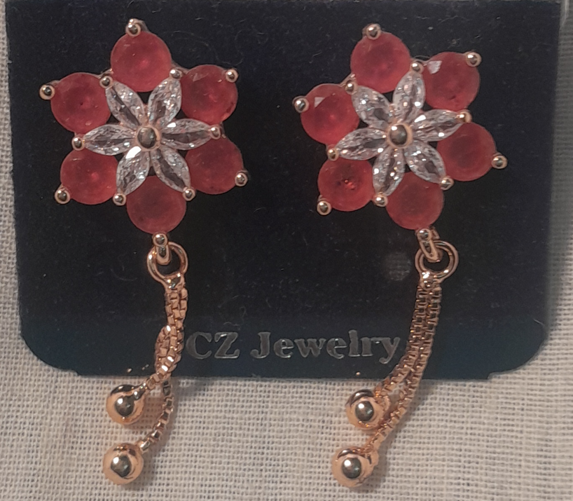 Vibrant floral drop earrings featuring red petal stones encircling a marquise-cut, finished with twin chain tassels tipped with gold-tone beads. Playful movement and standout color—perfect for festive outfits, parties, and gifting.
