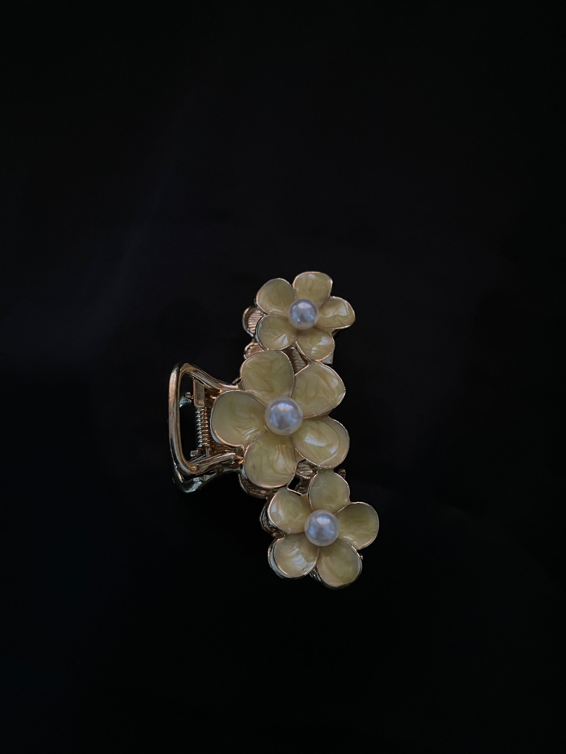 The floral Claw Clip pairs three glossy enamel blossoms with luminous pearl centers on a gold-tone spring clip. Lightweight but sturdy, it secures hair comfortably while adding a beautiful finish to updos, half-ups, or loose styles. Perfect for weddings or everyday looks that need a feminine touch.