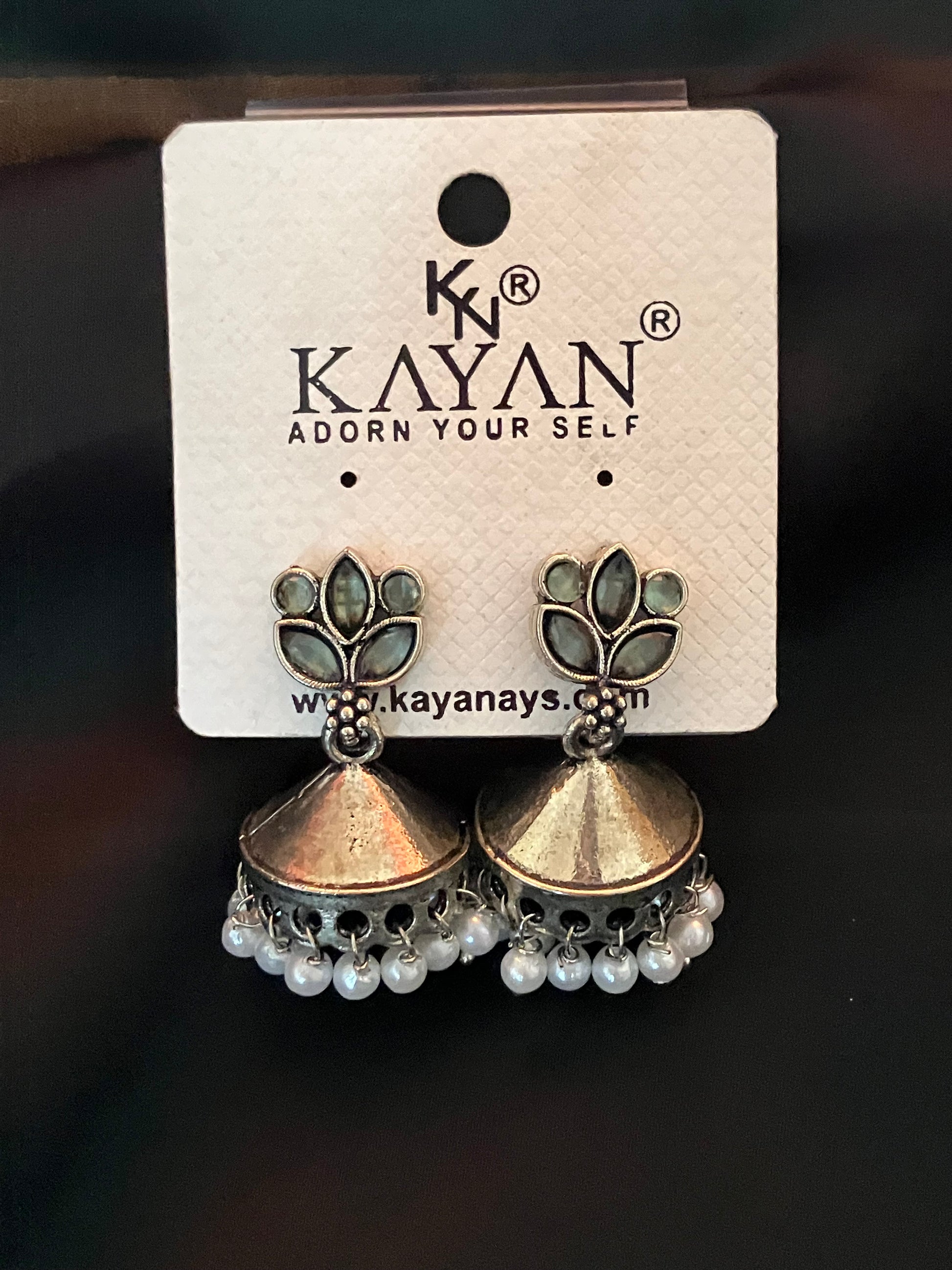 Add a touch of ethnic elegance to your look with these Oxidised Lotus Jhumka Earrings. The unique lotus-inspired stud pairs beautifully with the dome-shaped jhumka, while the dangling pearl beads add a graceful finish. Crafted with an oxidised silver polish, these earrings embody a rustic yet timeless charm. Perfect for pairing with sarees, kurtis, or Indo-western outfits, they’re ideal for festive celebrations, weddings, and casual ethnic wear alike.